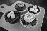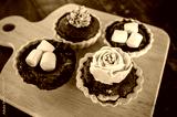 Close-up of Assorted mini brownie tart serving on the wooden table.