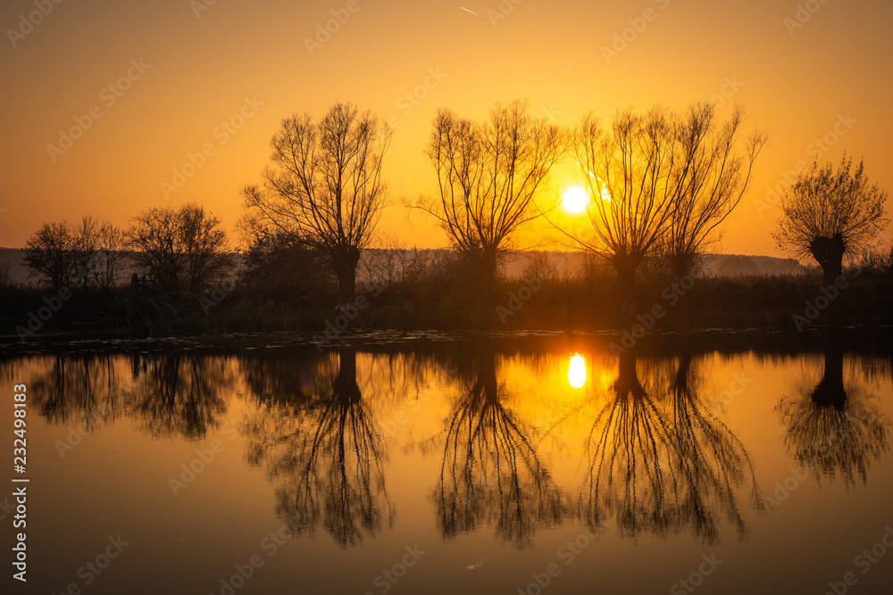 Sunset over the willows on the Habdzin lake near Konstancin-Jeziorna, Masovia, Poland