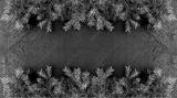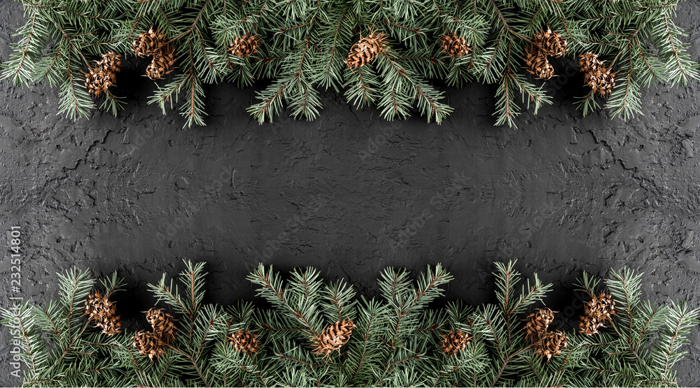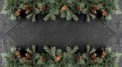 Creative layout frame made of Christmas tree branches and pine cones on dark background. Xmas and New Year theme. Flat lay, top view, wide composition