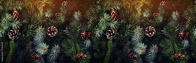 Holiday background of Christmas tree branches, spruce, juniper, fir, larch, pine cones with light. Xmas and New Year theme. Top view, wide composition, seamless pattern