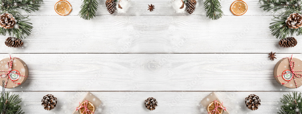 Creative frame made of Christmas tree branches on white wooden background with gift boxes, pine cones. Xmas and New Year theme. Top view, flat lay, wide composition