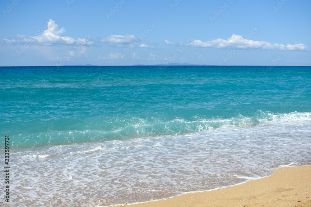 Big breaking wave on a sandy beach. Beautiful sandy beach with big sea waves on sunny summer day