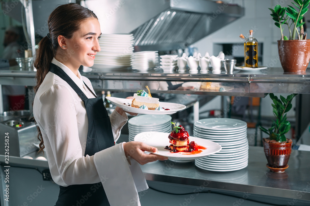 Waiter serving in motion on duty in restaurant. The waiter carries dishes.