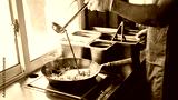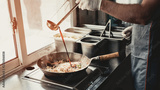 Close up. Worker Cooking Tasty Food in Food Truck.