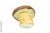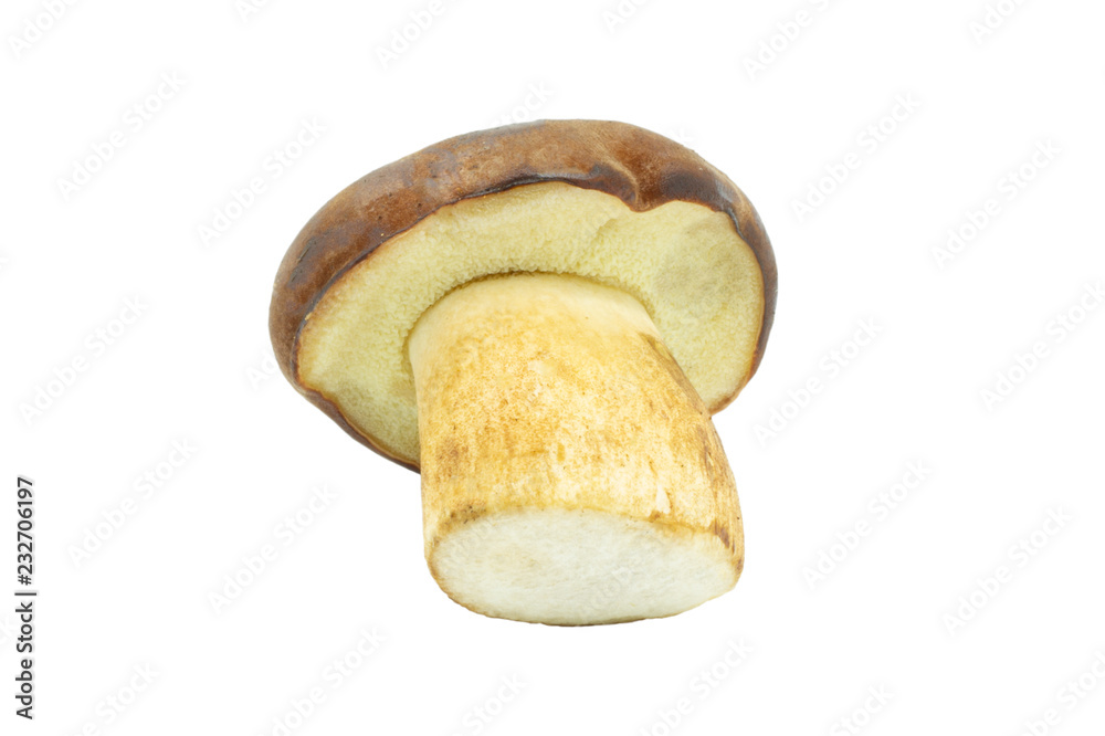 Gorgeous beautiful mushroom with a brown cap on a thick stalk. Yellow mushroom with a brown cap is isolated on a white background. Polish mushroom boletus.
