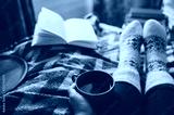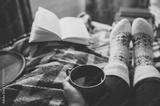 cozy winter day at home with cup of hot tea, book and warm socks. Spending weekend in bed, seasonal holidays and hygge concept