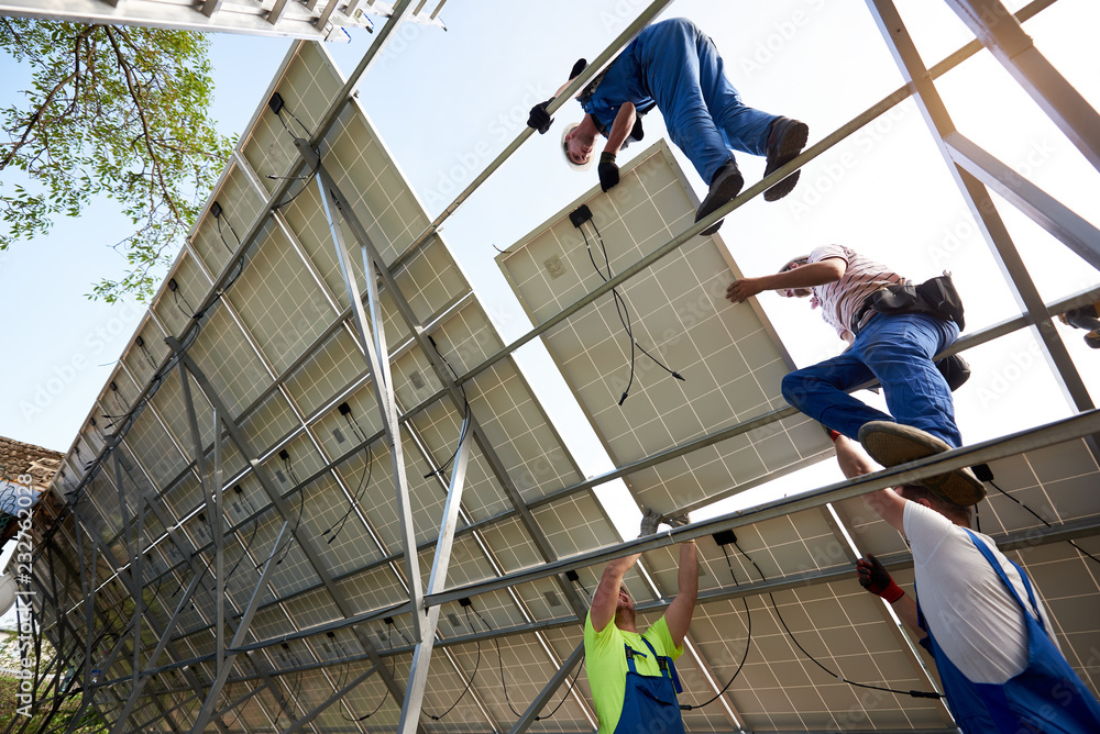 Bottom view from inside of stand-alone exterior solar panel system with team of engineers mounting on high steel platform on bright clear blue summer sky background. Green energy production concept.