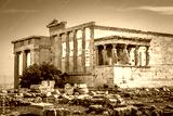 Erechtheion temple with Caryatid Porch on the Acropolis, Athens, Greece. Famous Acropolis hill is a main landmark of Athens. Ancient Greek ruins in Athens center. Remains of antique Athens in summer.
