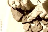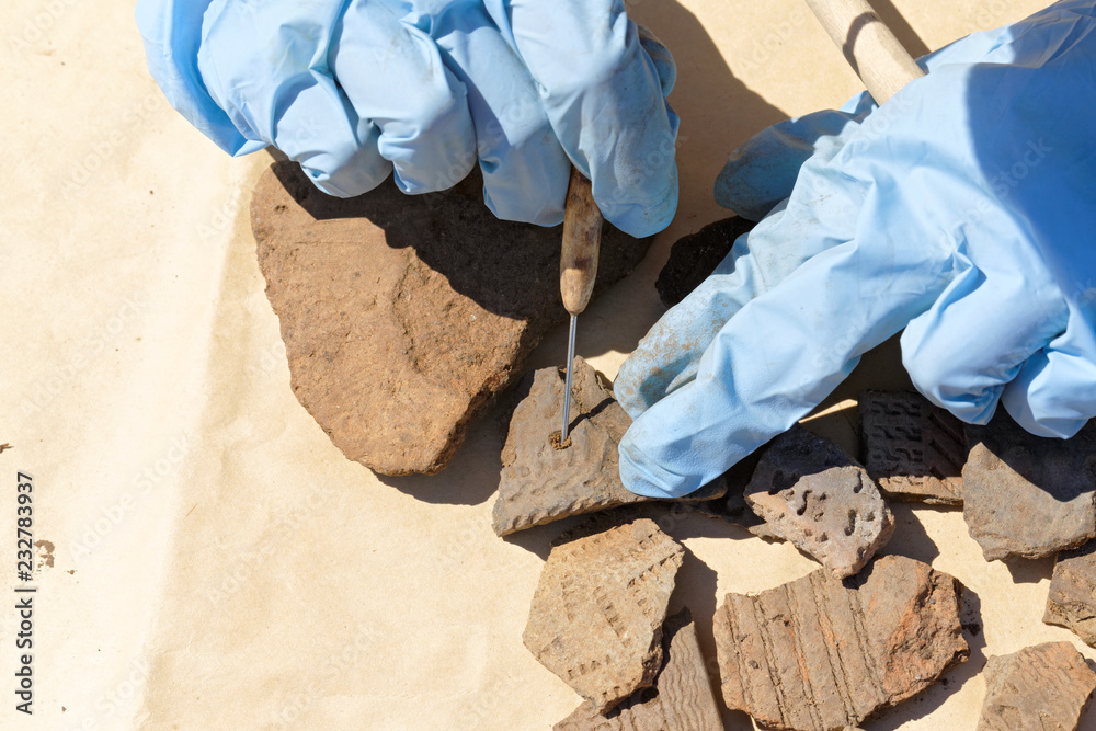 Hands archaeologist cleaned with a scraper of clay from a fragment of an ancient vessel