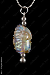 Collection of colorful glass beads, tassels, bracelets, pendants of different sizes and shapes. Colored Venetian, Murano glass, Silver glass, millefiori. Shot on a black background.