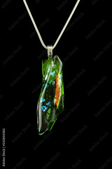 Collection of colorful glass beads, tassels, bracelets, pendants of different sizes and shapes. Colored Venetian, Murano glass, Silver glass, millefiori. Shot on a black background.