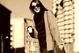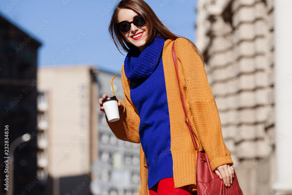 Young beautiful happy smiling woman posing in street. Model wearing stylish colorful knitted clothes, sunglasses, holding paper cup of coffee. City lifestyle concept. Copy, empty space for text