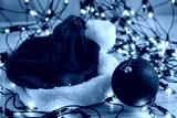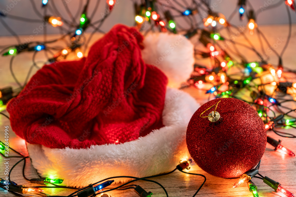 Christmas red knitted hat next to the Christmas ball on the background of a garland of lights