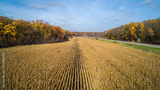 Aerial view of road in autumn forest at sunset near the corn field.