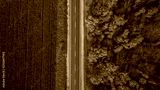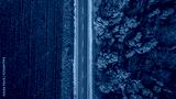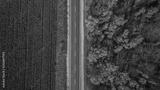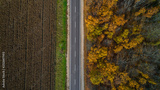 Aerial view of road in autumn forest at sunset. Amazing landscape with rural road, trees with red and orange leaves in a day near the corn field.