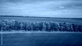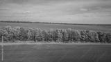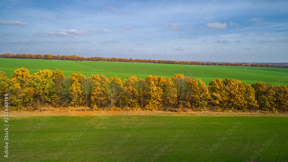 Aerial view of the large wheat field in autumn. Amazing landscape with trees with red and orange leaves in a day in the wheat field.