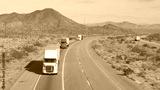Cars and trucks driving on busy highway, freight semi trucks transporting goods