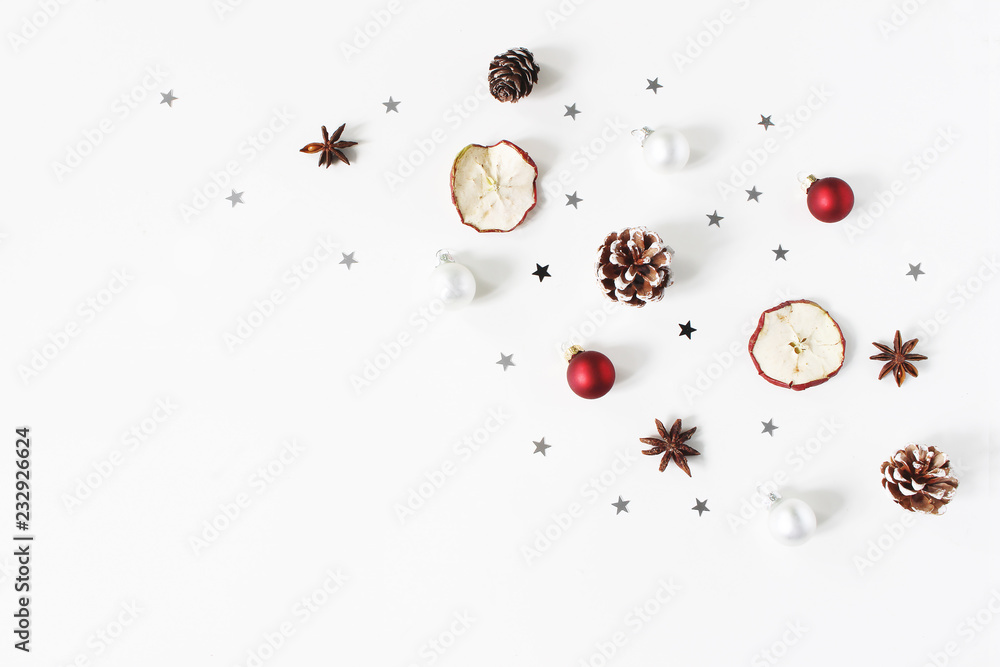 Christmas festive composition. Decorative pattern. Red Christmas balls, baubles, pine cones, dried apple fruit, anise and silver confetti stars isolated on white wooden background. Flat lay, top view