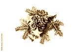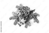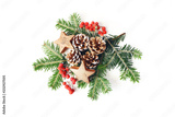 Christmas festive styled composition. Winter floral arrangement. Pine cones, fir tree branches, red rowan berries and wooden stars and on white table background. Flat lay, top view.