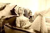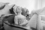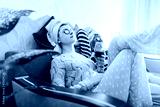 Mother and her adult daughter applied facial masks and cucumbers on eyes. Women chilling while having wine