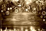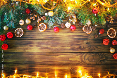 Merry Christmas and happy New year. Spruce branches and Christmas toys on a wooden background. Background with copy space. Top view. Christmas background.