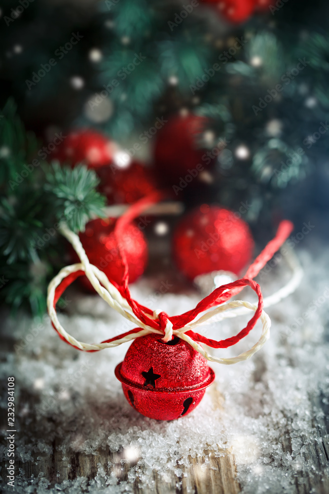 Merry Christmas and happy New year. Christmas toys and Christmas tree on dark wooden background. Vertical.