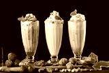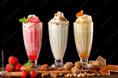 Three sweet milkshakes with nuts, caramel, strawberry and whipped cream at a wooden board on table background.