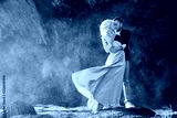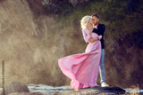 Man and a woman hugging in the summer at sunset in beautiful clothes. Couple in love stands on the shore on the rocks in the sun, hugging and kissing in the splashes of water. Pink dress