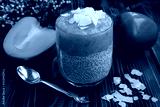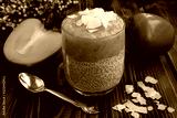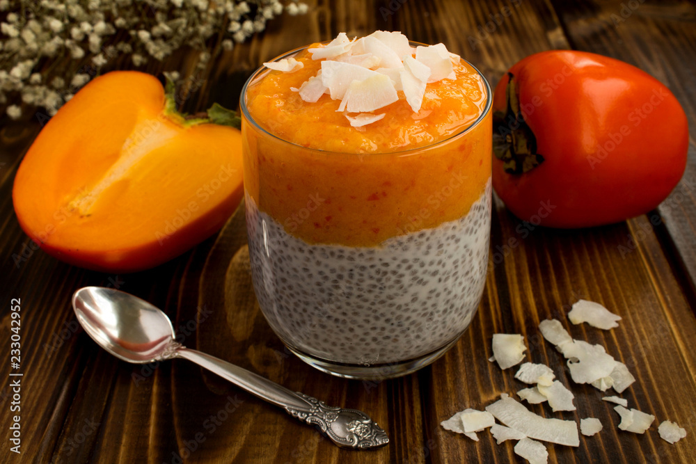 Pudding with chia,persimmon and coconut chips on the brown wooden background