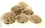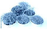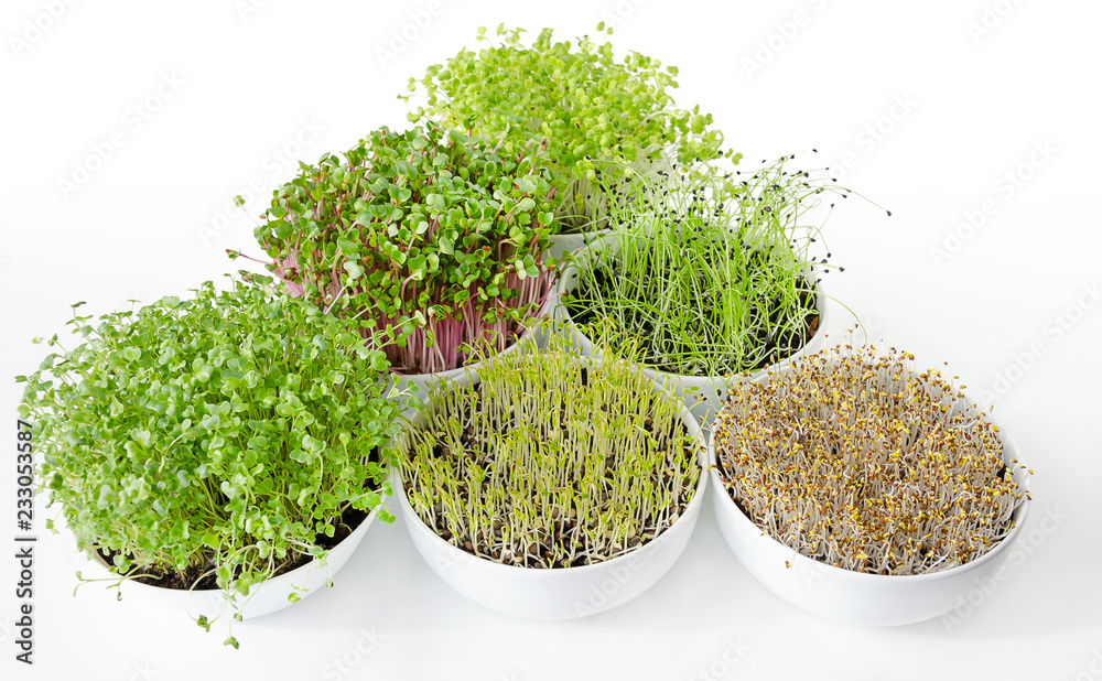 Microgreens and sprouts triangle in white bowls. Shoots of alfalfa, Chinese cabbage, garlic, kale, lentils and radish in potting compost. Green seedlings, young plants and cotyledons. Food photo.