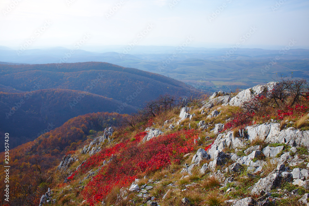 Autumn landscape with red leaves and in Bukk mountains, Hungary