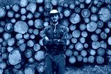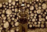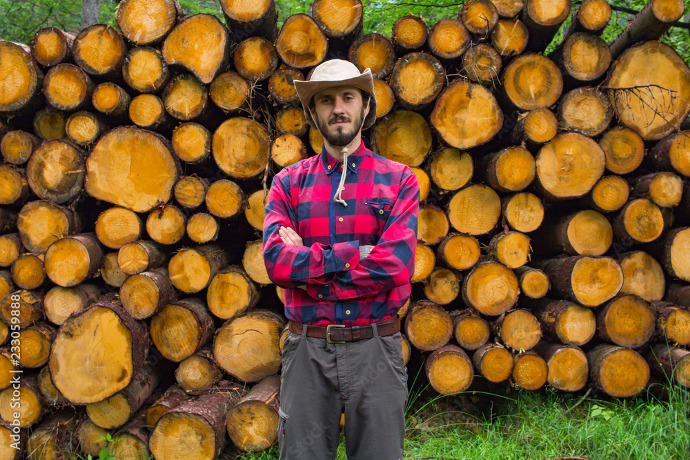Portrait of lumberjack in forest, many big logs of pine on background. Young male hiker posing near the sawmeal in the pines forest.
