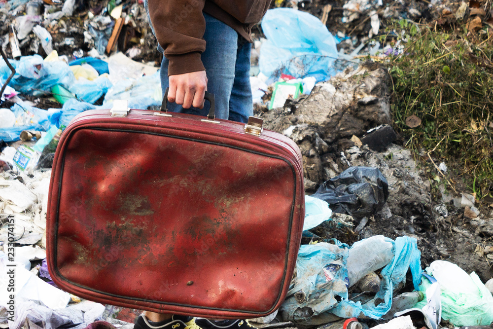 European guy with a red suitcase on the background of garbage, a tourist at a landfill, ecology of the planet