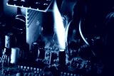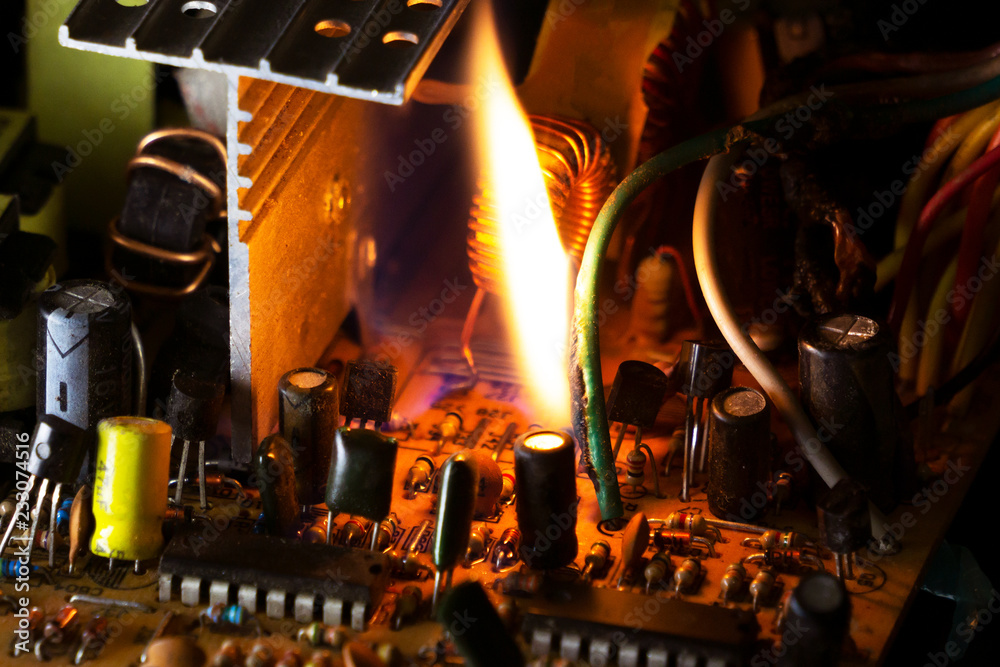 computer power burning, on a black background, close-up, short circuit, electrical equipment ignition