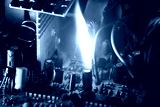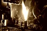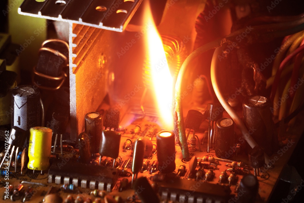 computer power burning, on a black background, close-up, short circuit, electrical equipment ignition