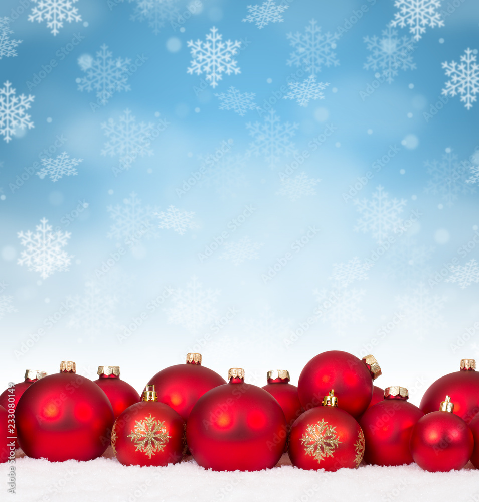 Weihnachten viele rote Weihnachtskugeln Dekoration Schneeflocken Quadrat Schnee Winter Textfreiraum Copyspace