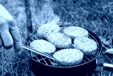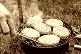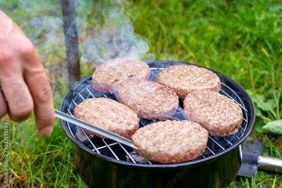 A man with a skewer turns burgers on the grill