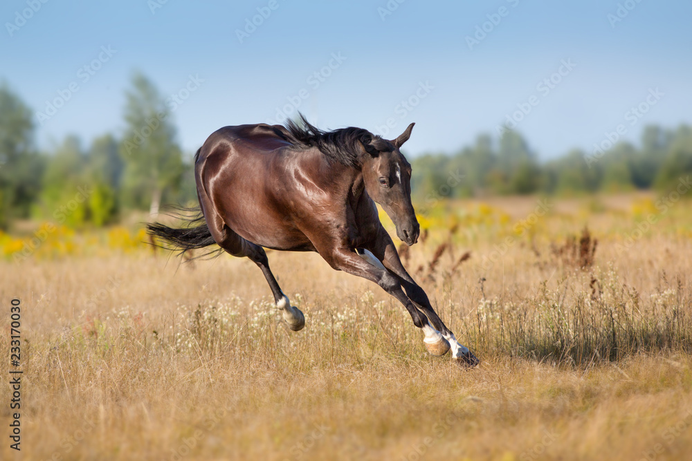 Black horse run gallop in autumn meadow