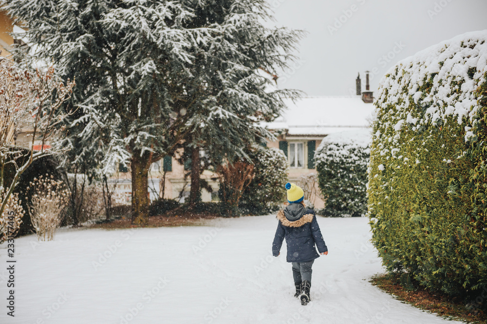 Outdoor portrait of funny little boy having fun under heavy snowfall