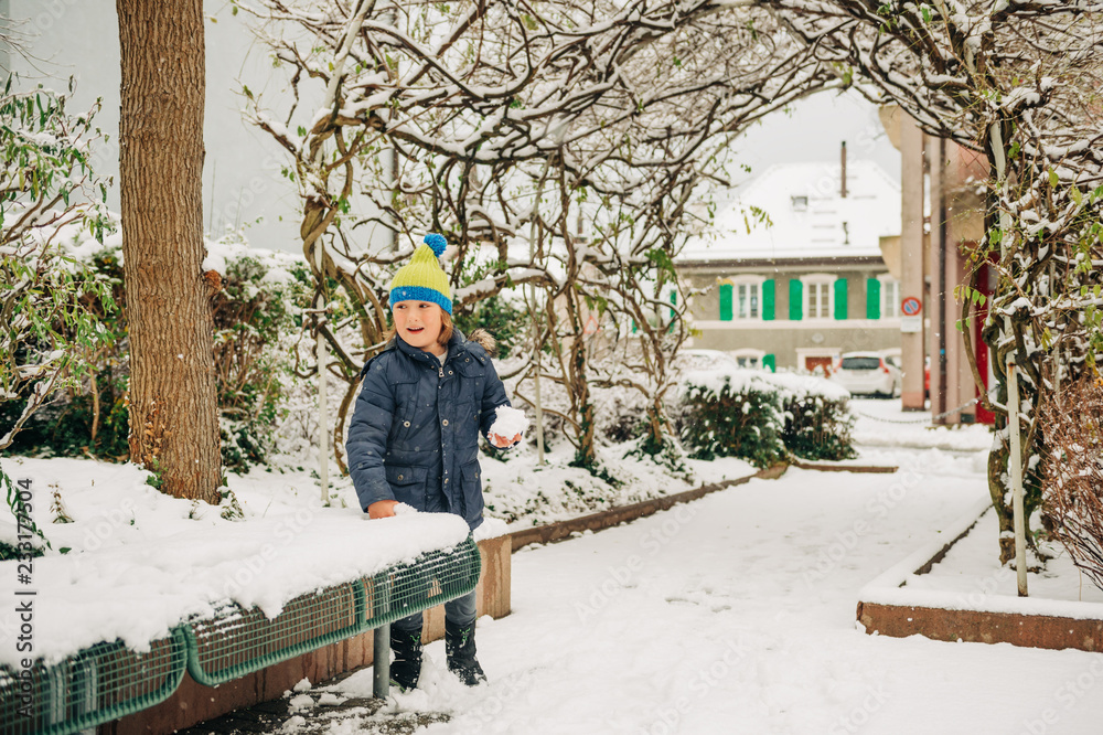 Outdoor portrait of funny little boy having fun under heavy snowfall