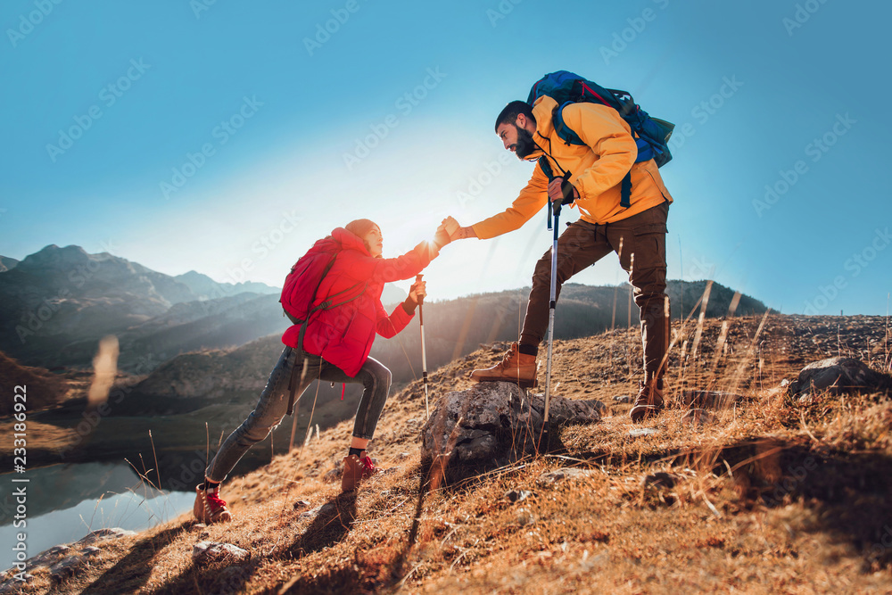 Helping hand - hiker woman getting help on hike happy overcoming obstacle.