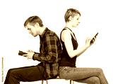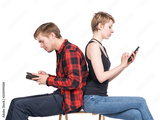 Young couple sitting on one chair back to back and looking at his smartphones isolated