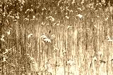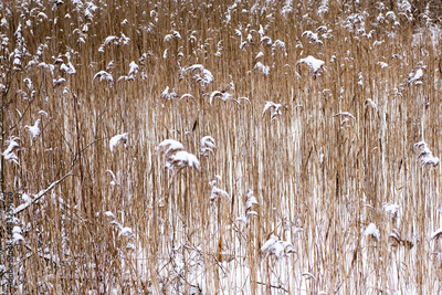 Dried dry grass under the snow on the shore of a frozen winter lake