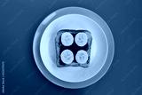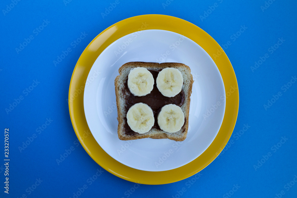 One slice of toast bread with chocolate cream and banana in the colorful plates on the blue background.Top view.