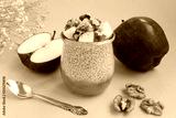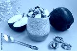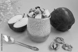 Pudding with chia, apples,cinnamon and walnuts on the yellow background