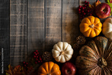 Top view of Autumn maple leaves with Pumpkin and red berries on old wooden background. Thanksgiving day concept.