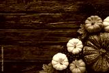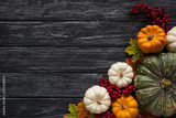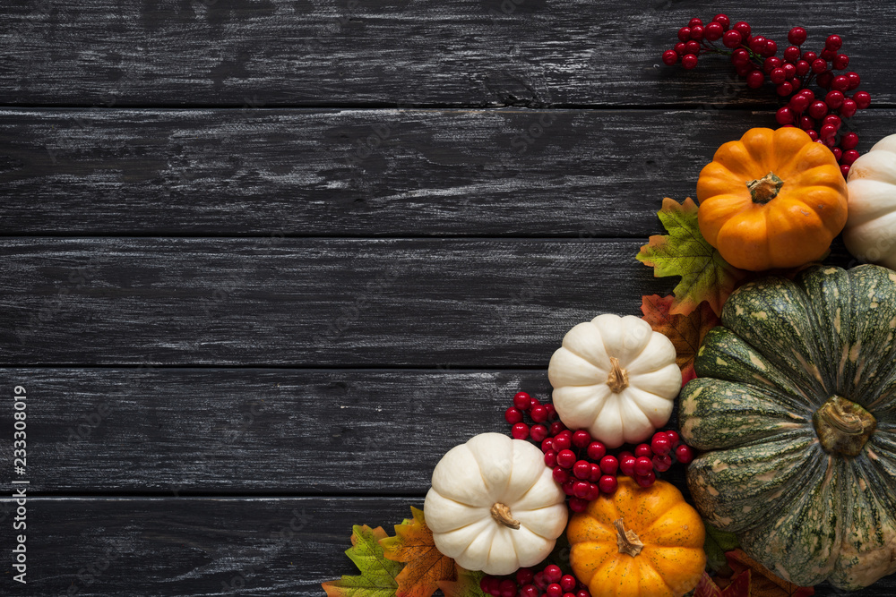 Top view of Autumn maple leaves with Pumpkin and red berries on old wooden background. Thanksgiving day concept.
