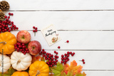 Top view of Autumn maple leaves with Pumpkin and red berries on white wooden background. Thanksgiving day concept.