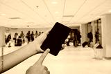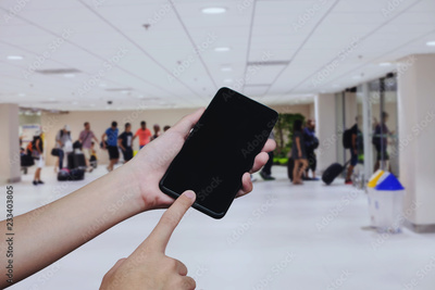 Hand hold and touch screen on smartphone or cellphone over blurred in hall.