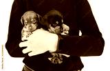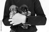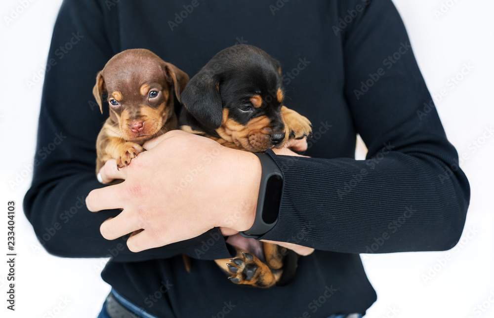 Two small puppies of dachshund isolated in the hands of its female owner.